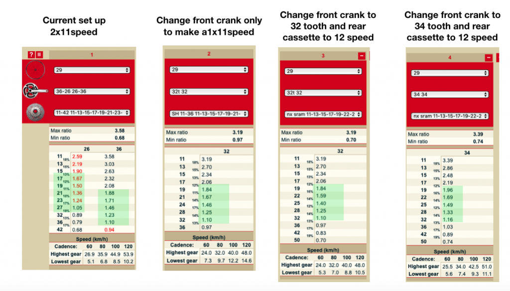 Image 3: Then if we went ahead and make it a 12 speed and kept the 32 crank, again he hasn’t gained much. What Tim really needs is something suitable between the 1.80 to 2.0 ratio.
