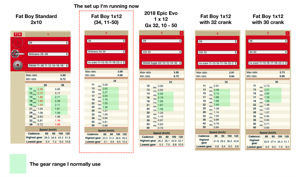 For example. The Epic Evo (Jas and Phil have, I have a broken one), I always felt there was a dead spot in the 1 x 12 gearing for me. When I went to the fat boy the dead spot disappeared but the gearing range seemed similar to the Epic Evo. (not the same as it was a different crank to cassette set up)