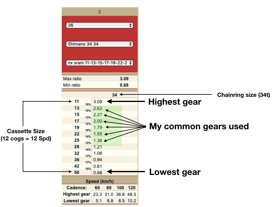 So on my new 12x set up, 34 crank and 11-50 cassette a 3.09 means that one full turn of my crank = 3.09 turns of my rear wheel. In this instance that is my top gear.