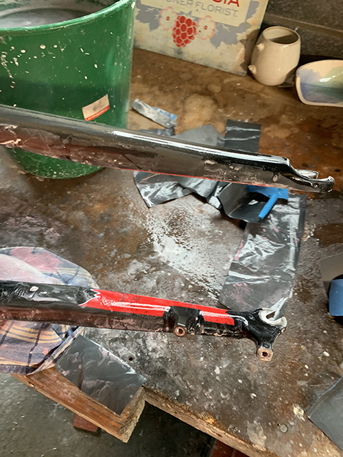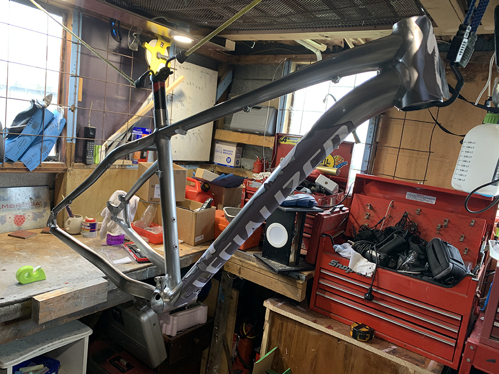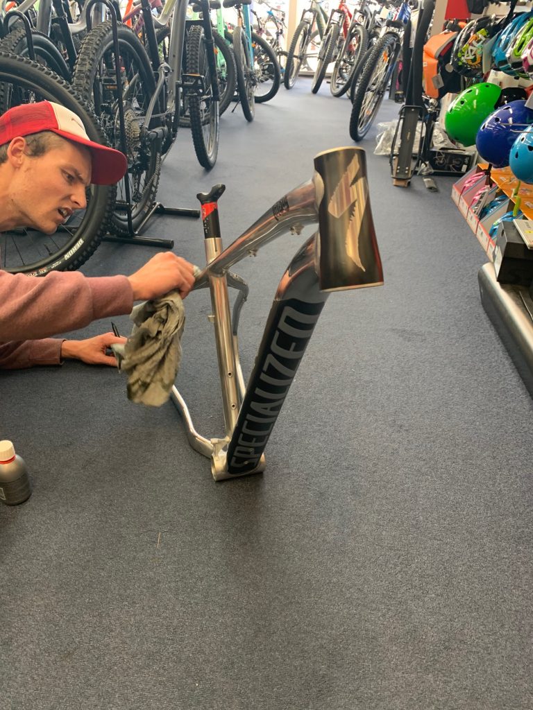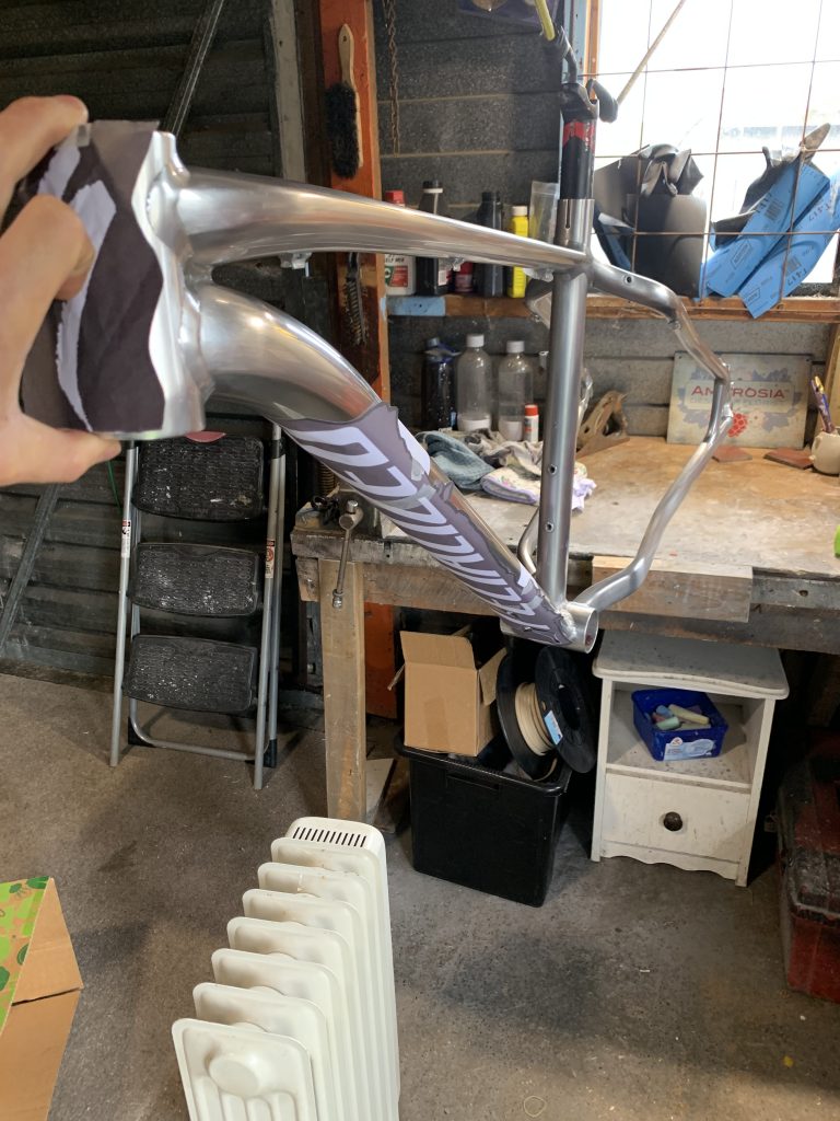 Here is the first coat being applied by one of the guys in the Local Bike Shop. This photo is iconic because Mat here is a champion NZ road cyclists, and the fact I have him polishing my MTB frame is priceless.