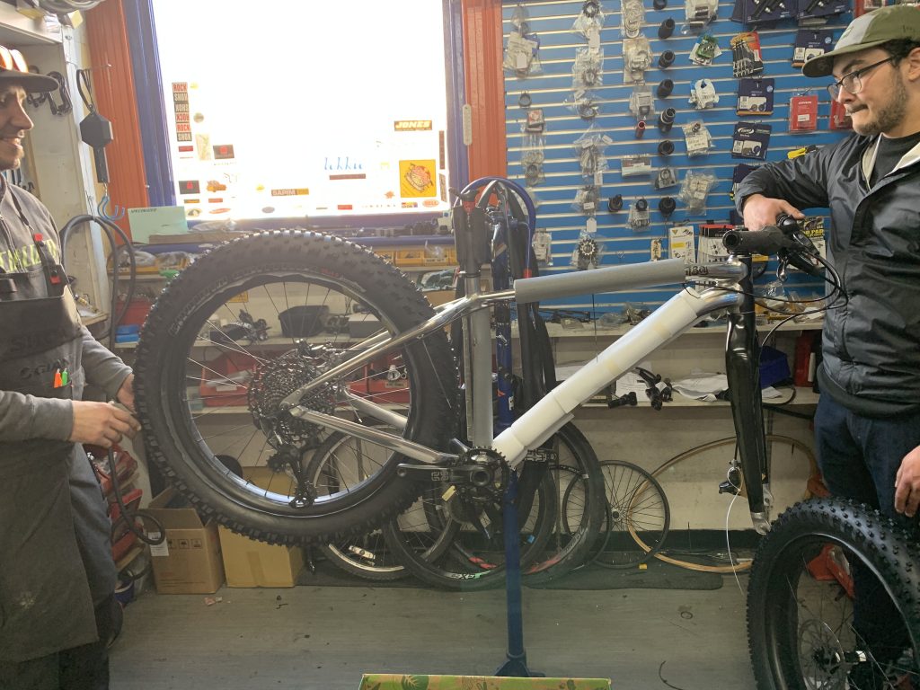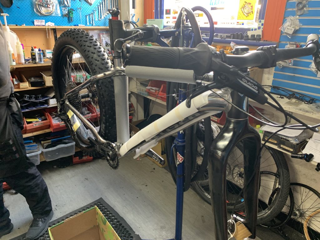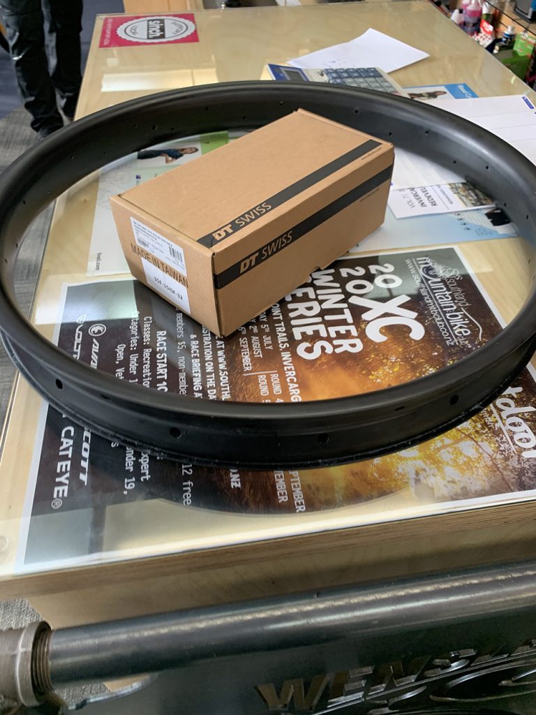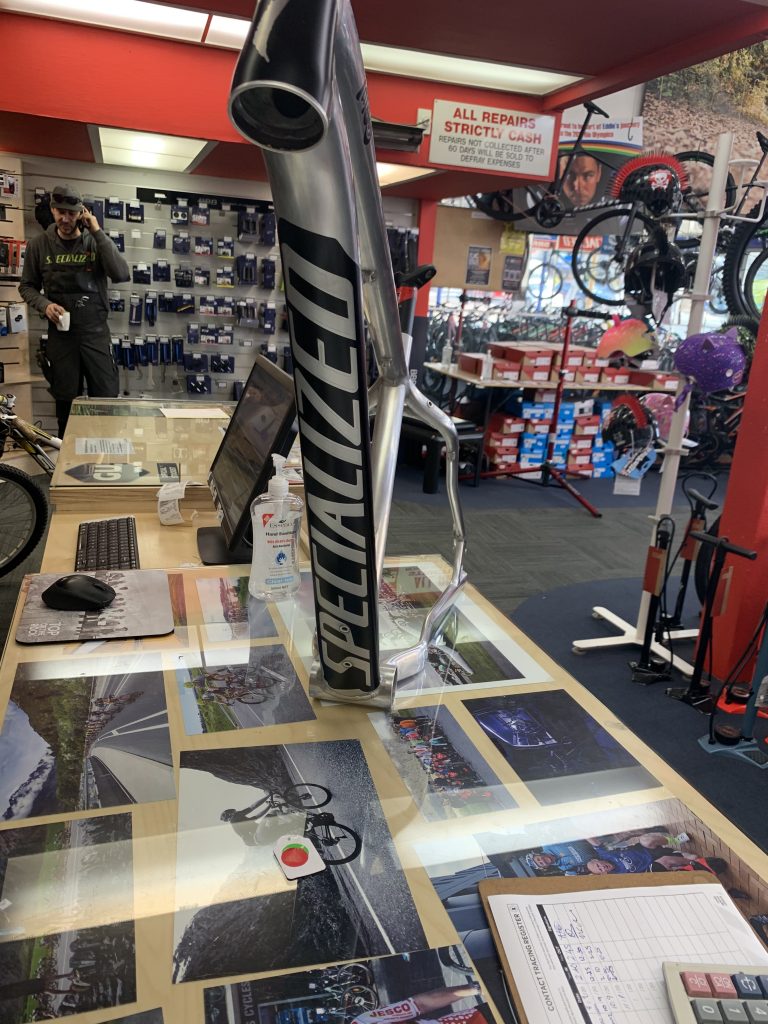 At the bike Shop. The Boys putting it together. Missing End Caps from new DT Swiss front, caused a 2 week delay. while we sorted a fix with actuals on backorder into NZ.