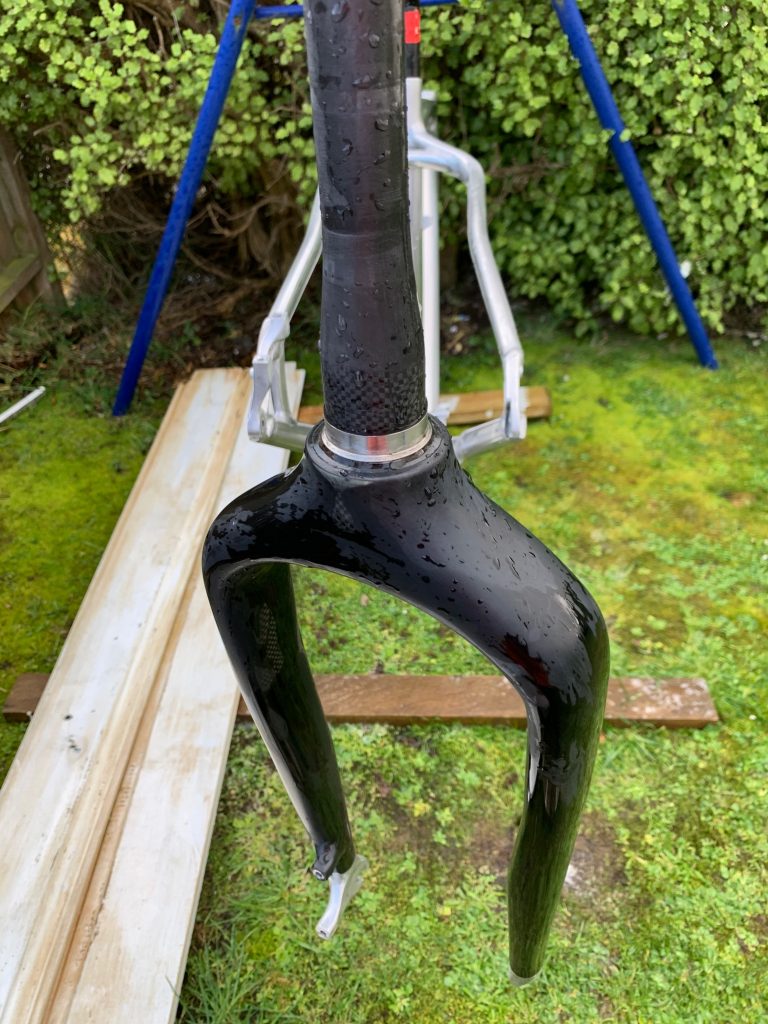 The carbon fork was the most time-consuming part. I started at 1000 grit got impatient after about 3 days and went 400, 800, and back to 1000. The black paint and carbon parts of the fork looked the same in places so it was hard to determine when to stop. ideally, you won’t want to sand your fork into nothingness.