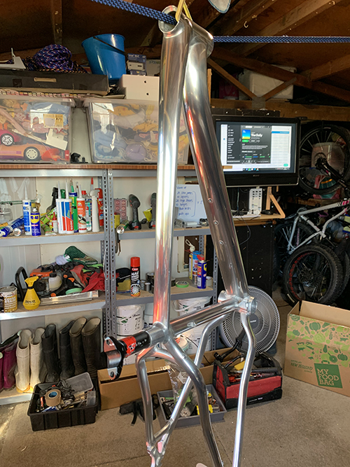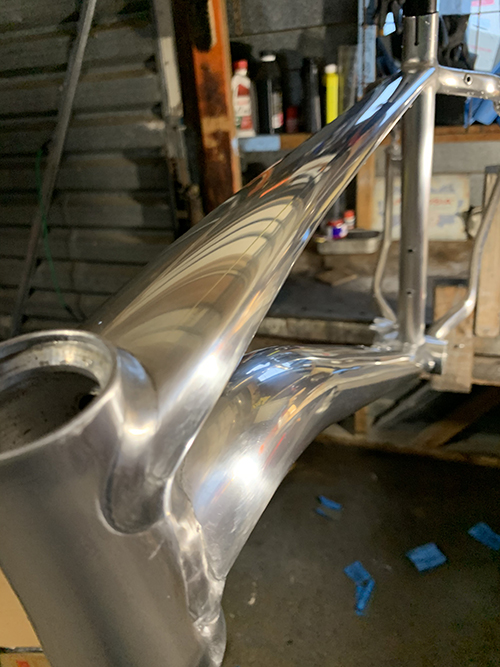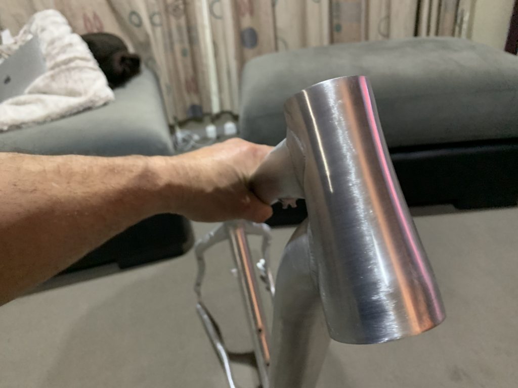 I started polishing around the 1000 grit sandpaper mark. I got fussy with the Top tube and the side of the bottom tube because that is what you see the most of. Going 1500 and 2000 grit made a massive difference. The last sand on the frame was 2000 grit, all over. The back rear frame arms got less attention.