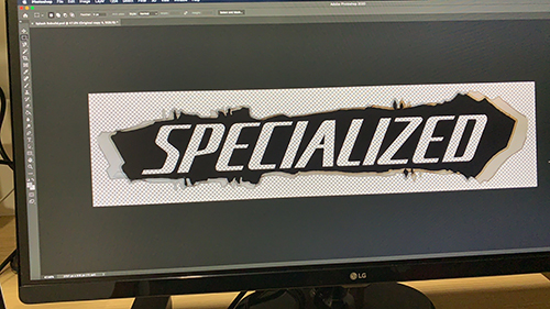 So, in photoshop, I moved the lettering in the graphic so that the SPECIALIZED sat lower to the bottom bracket. I also opened up the font on the “S” and the “P,” widening enough, so the divet sat inside those letters. I also had to widen the Splash, so it wrapped more evenly around the bottom of the frame to the edges.
