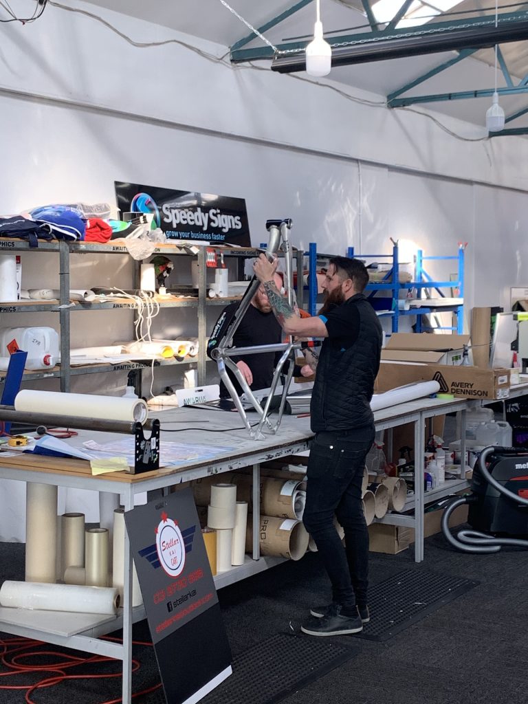 Sign Writers Applying Graphic I designed. The finish print is Saturn Black. With a clear wrap applied over the top of the SPECIALIZED splash.
